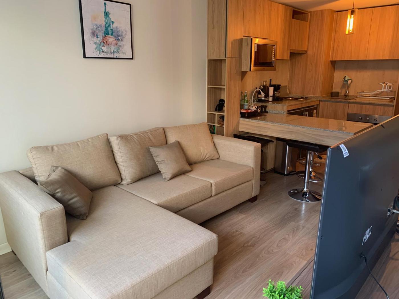 Santiago Centro - Dpto Boutique con Patio Privado está en el centro de Santiago y tiene centro de fitness, un jardÃn, wifi gratis y parking privado gratis. Este apartamento dispone de salón de uso común, además de terraza.